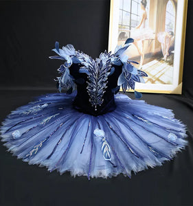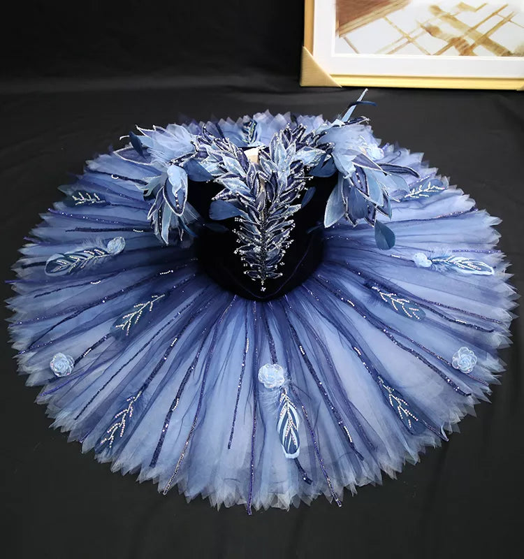 The white, professional pancake tutu skirt features a dark blue overlay, embellished with silver appliques and black sequins.
