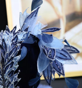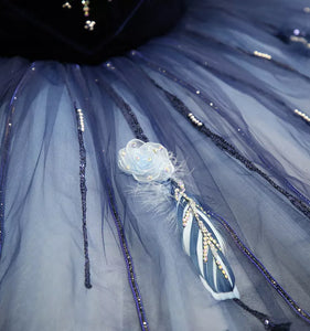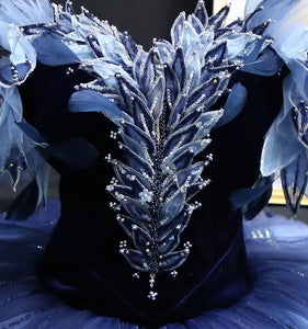 The bodice of this stage costume is made with dark blue velvet. The decoration is unique, made with blue real feathers, silver appliques, pearls and sequins in form of a long trail. The same decoration is also attached to the nude straps, making this costume unique.