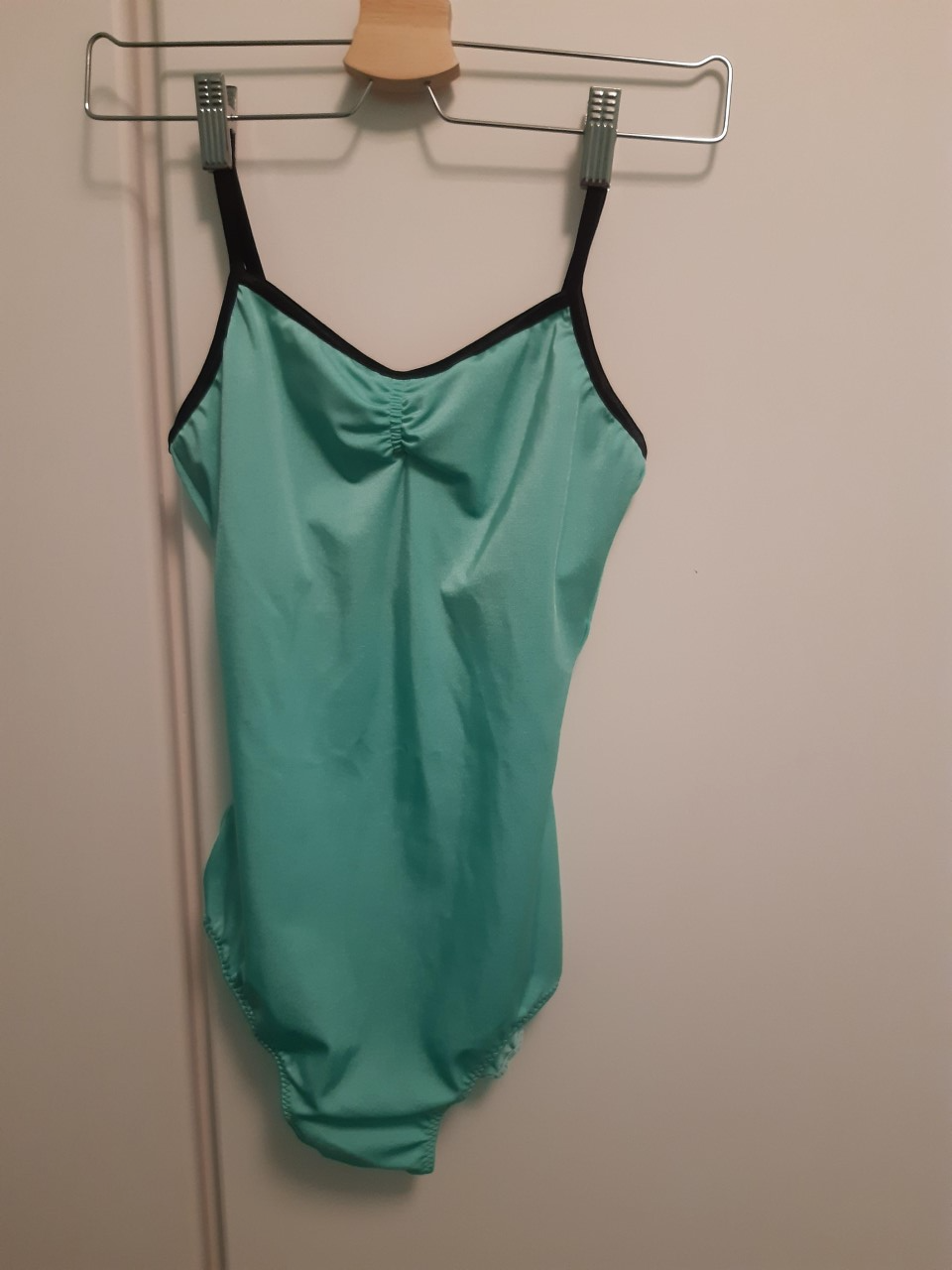 An amazing shade of mint/aqua green for this spaghetti straps lycra leotard. Black trims, square back, and gathered front.