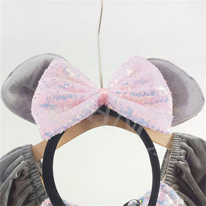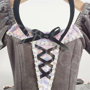 Nutcracker mouse costume for girls. Absolutely adorable, featuring grey velvet bodice and overlay., over a pink pancake tutu skirt. Pink flower appliques are sewed on the edges of the velvet overlay.The bodice has a white central insert with black laced pattern and white appliques and lace accents. Grey velvet puffy short sleeves. Long velvet tail with pink bow at the end, attached to the back of the costume. Headband with attached mouse ears and central pink bow.