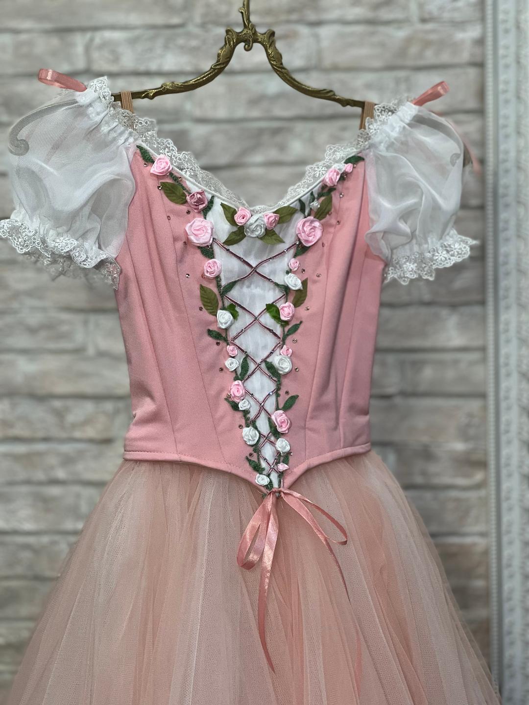 The bodice is made following the peasant style, with rose semi stretchy special fabric, a white undershirt with laced pattern, short organza puffy white sleeves decorated with lace trim, and rich pink floral appliques.