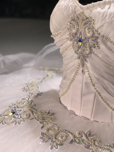The slightly bell-shaped, 10 layers professional tutu is white. There is an overlay made of white organza. The overlay is richly embellished with silver appliques, blue and clear crystals.