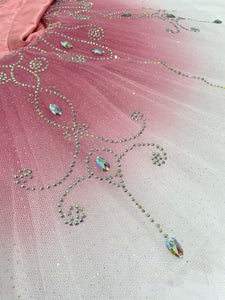 The skirt is the highlight of this tutu. Made with glittery tulle, and gradient pastel pink color, fading to white. The edge of the tutu are nicely scalloped and decorated with silver appliques.