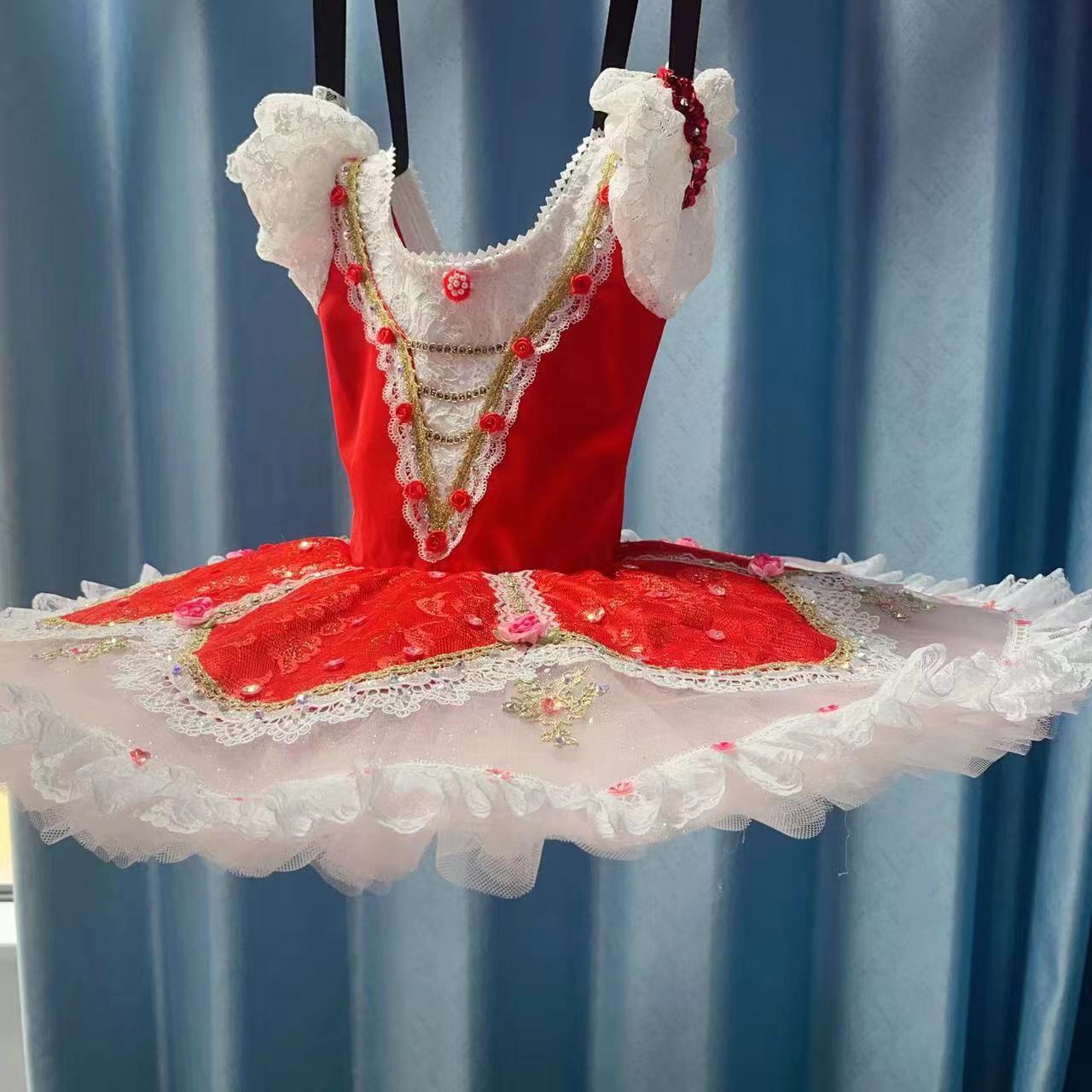 This lovely, red and white tutu, features a red velvet bodice with a white undershirt and a laced pattern, floral appliques and short white sleeves.