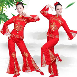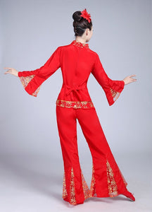 This two piece costume features red satin pants and long sleeved tunic with rich gold decoration.