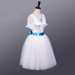 This white knee length tutu features a round neck satin bodice with white chiffon three quarter sleeves and lace decoration. A little blue satin bow decorates the chest area.