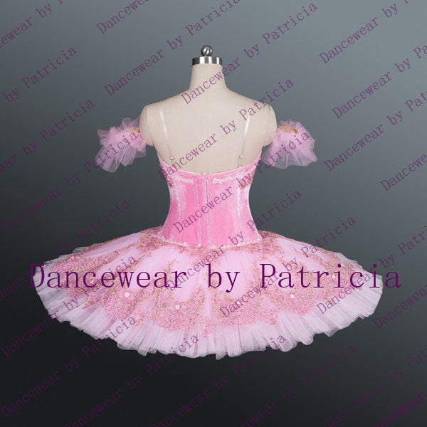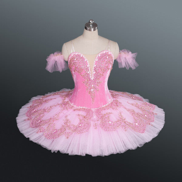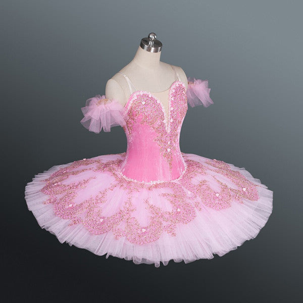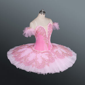 The 12 layers professional tutu skirt is created using a matching shade of pink. Rich gold, darker pink, and light pink appliques and crystals make this costume extremely shiny under the stage lights.