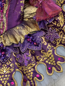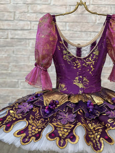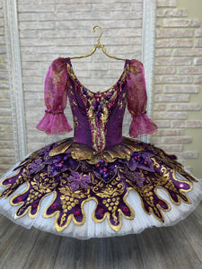 The bell shaped professional tutu skirt is white. Three different tutu skirts cover the white tulle. Purple satin with golden plum design, purple vine leaves appliques. Goden grapes, and a small golden tutu skirt.