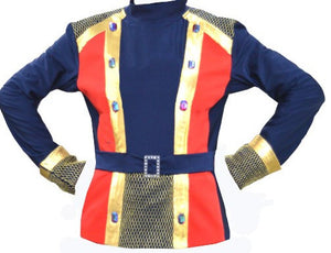 This blue male vest is made professionally using blue fabric with red and gold decorations, golden buttons, golden decorations on the wrists and shoulders, and a blue belt.