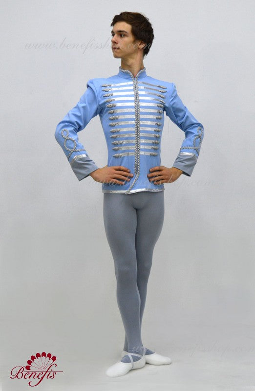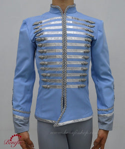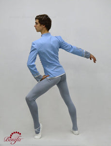 This professional male stage costume is made with high quality fabric and is decorated with silver trims in the front and on the sleeves.