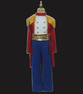 Children costume for the role of the soldier in the Nutcracker ballet. Red jacket with white undershirt and blue long pants. Gold sash and golden fringes on the shoulders, as well as golden buttons.