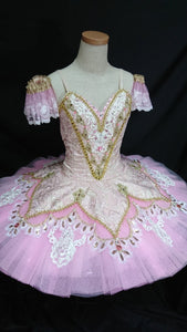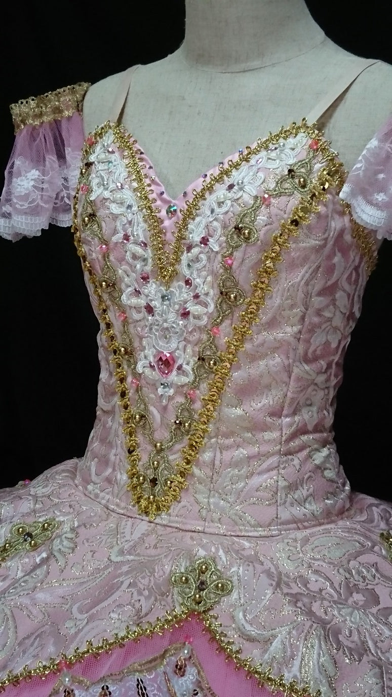 The slightly bell-shaped pink tutu skirt is decorated with a floral motif, gold appliques and trims. Hundreds of sequins and sparkles were used for this tutu, in order to obtain an incredible sparkle on stage.