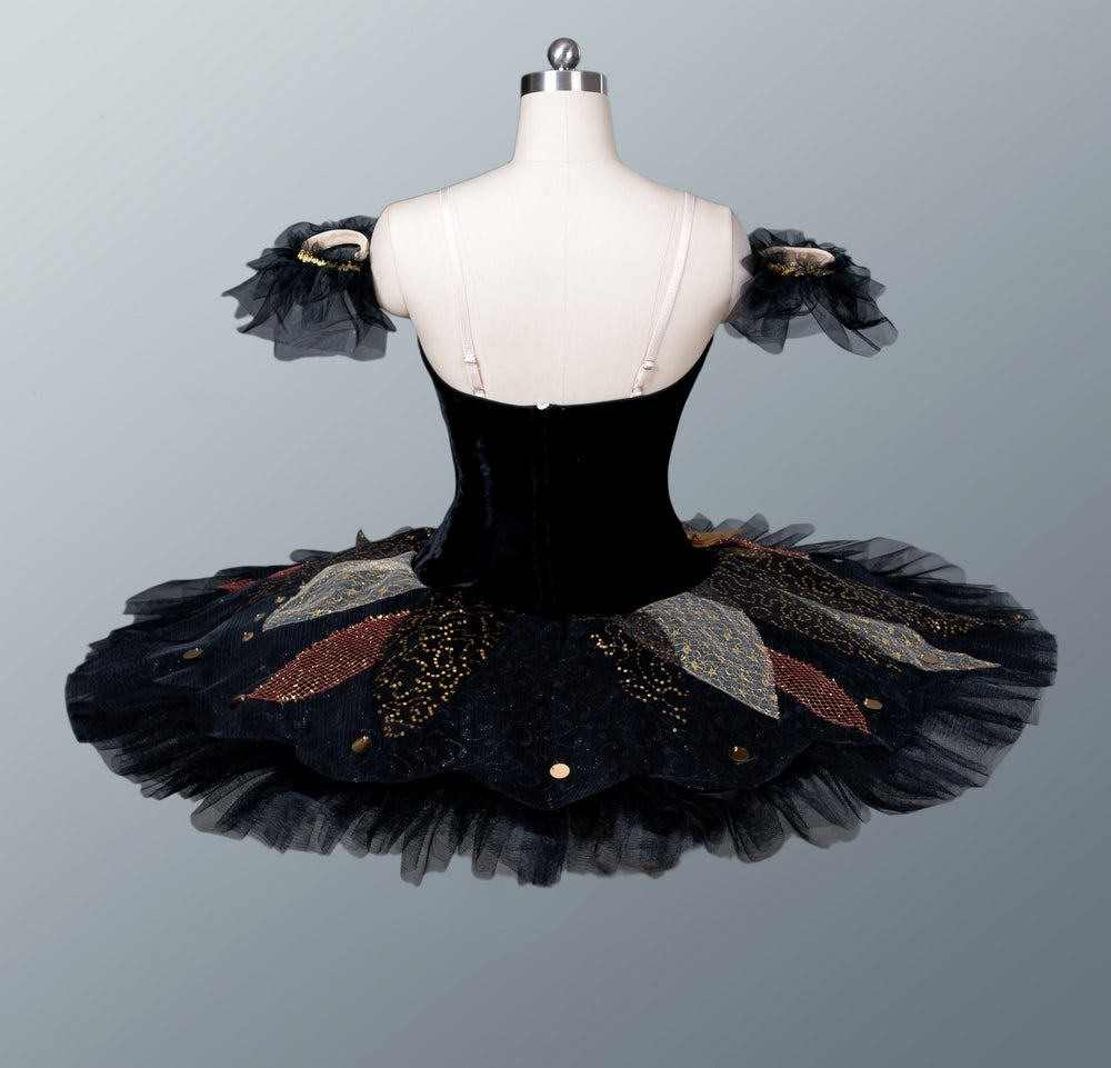 The pancake, 12 layers tutu skirt is black. The decorations on the tutu overlay are very rich and made with different types of golden shiny lace, and crystals.