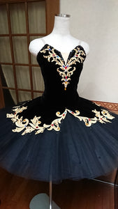The professional,bell shaped tutu skirt is made with black tulle of the highest quality. Black rhinestones are also scattered on the skirt for extra shine.