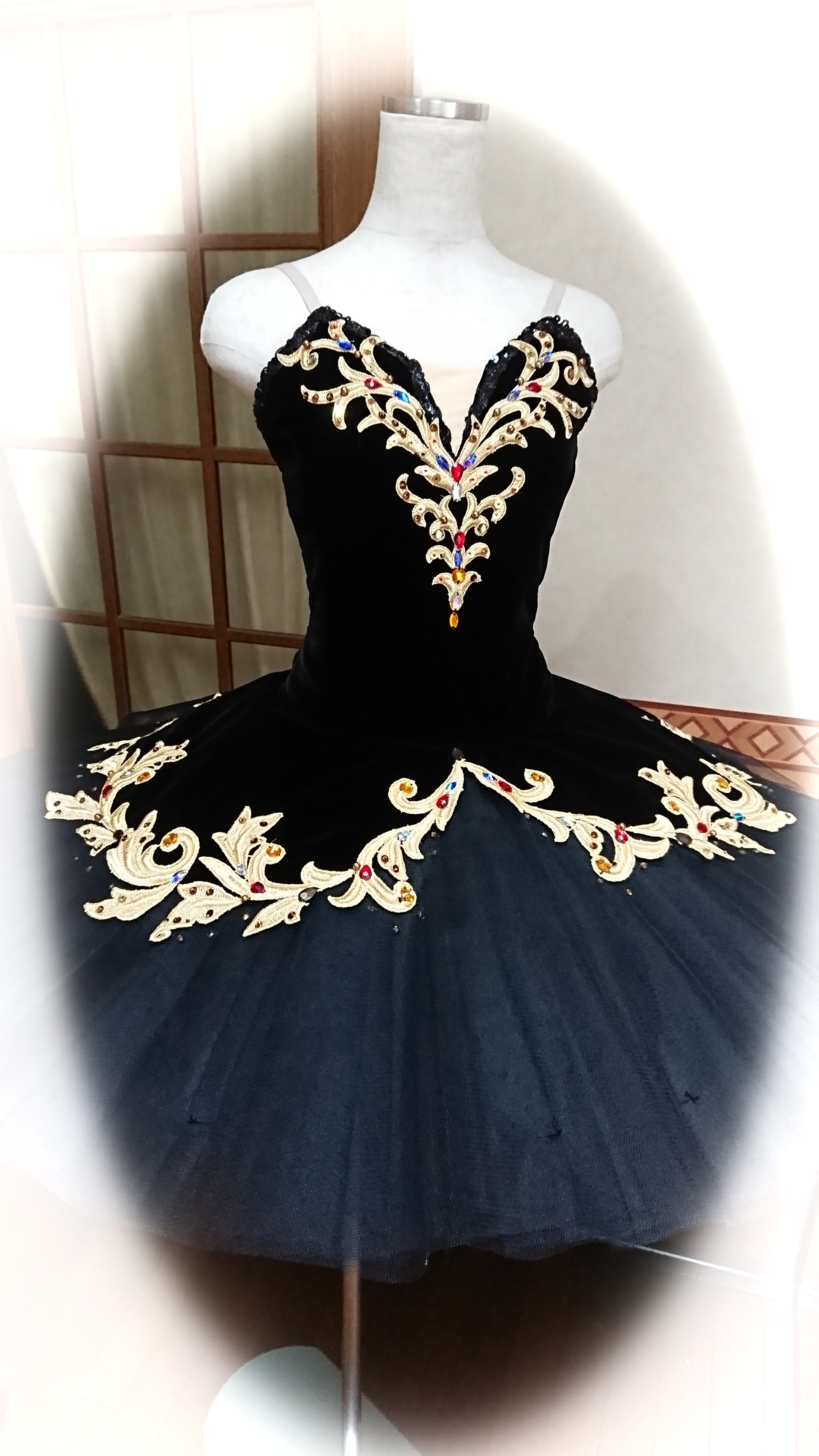 The black velvet enxtends itself onto skirt, in form of a tutu skirt open in the center. The edges are richly decorated with gold appliques and Swarovski crystals as the bodice.