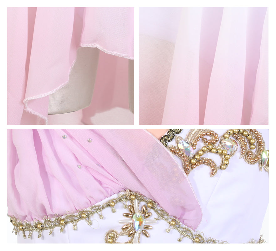 The top of the dress is richly decorated in gold, featuring gold appliques, crystals and trims. A pink chiffon scarf is draped around one side of the chest, and falls behind as a small scarf. Golden trims are also decorating the waist line.
