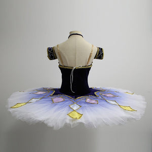 The pancake tutu skirt is hand dyed ombre', featuring deep blue in the top area, then fading to white.