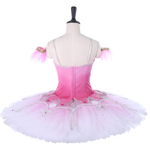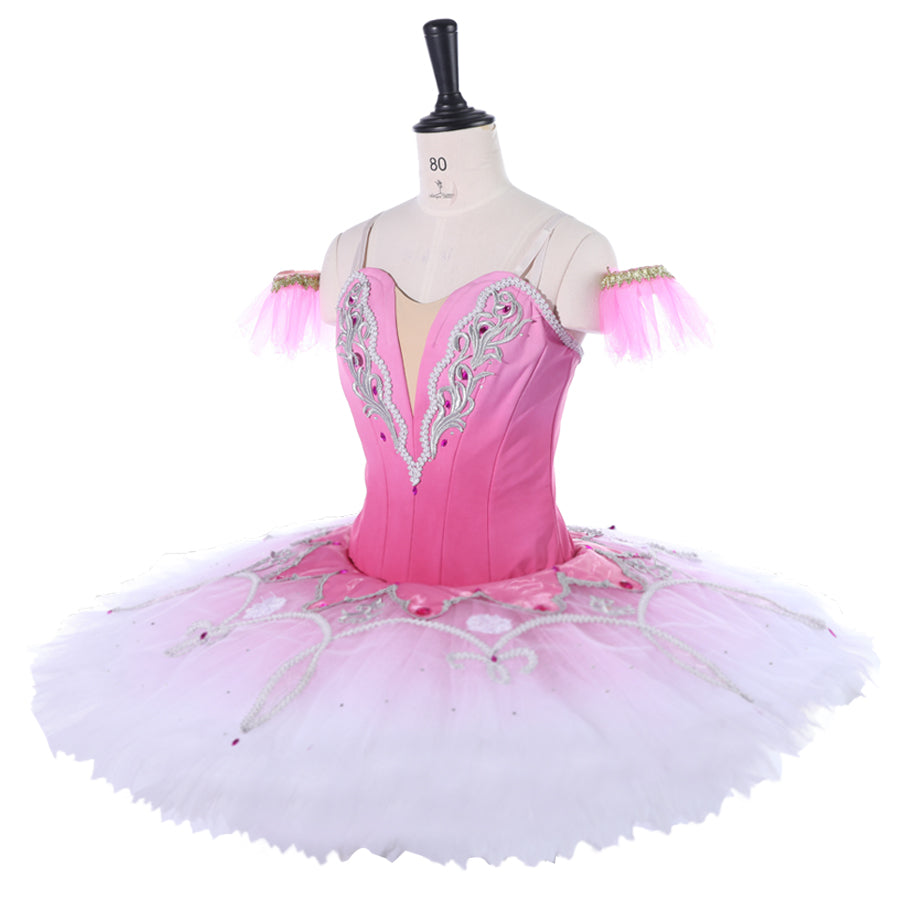 The pancake, 10 layers tutu skirt features the "reverse ombre" technique. The top part of the skirt i pink, and gradually fades to white. A flower shaped small tutu skirt and rich silver decorations complete the look of this stunning tutu.