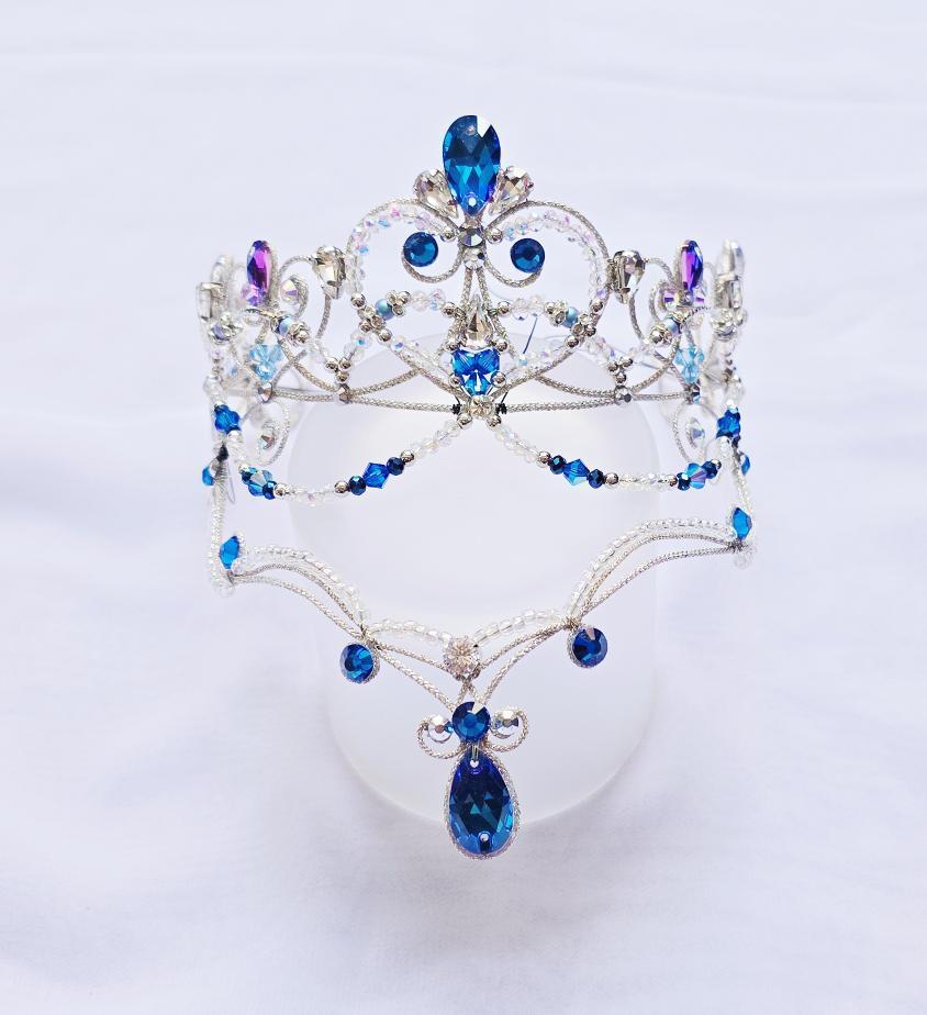 An amazing new exclusive creation! "Once Upon a Time" is the tiara of your dreams! Created for any Princess or Fairy role, this headpiece will steal the attention of the audience. Hand wired and made on a silver base, it features blue, and AB Swarovski crystals reflecting and capturing the light and changing color in an amazing way!