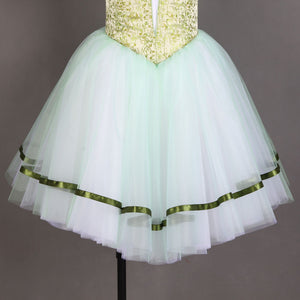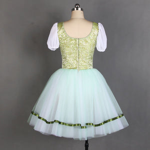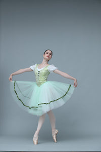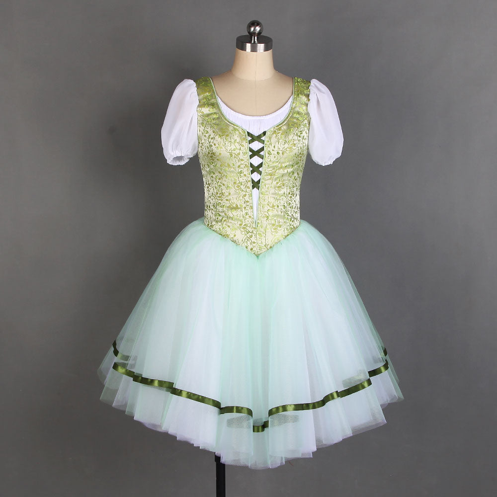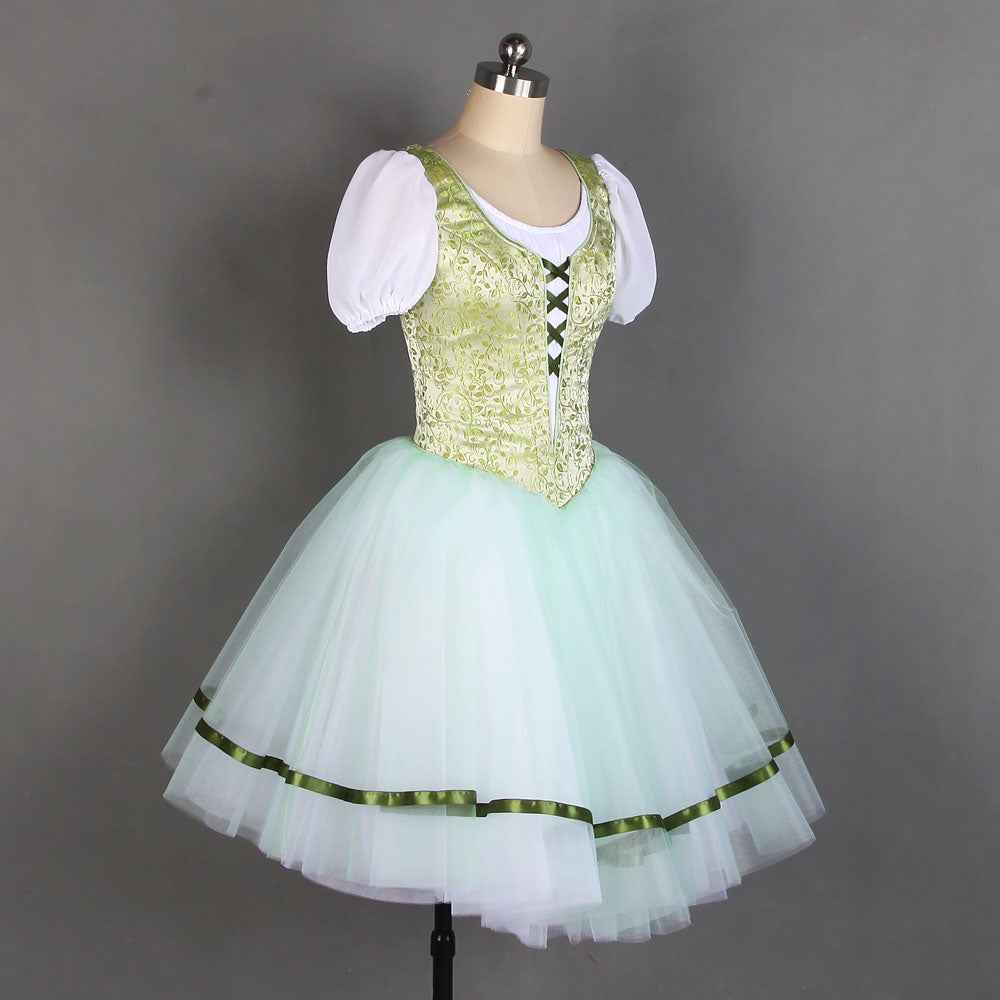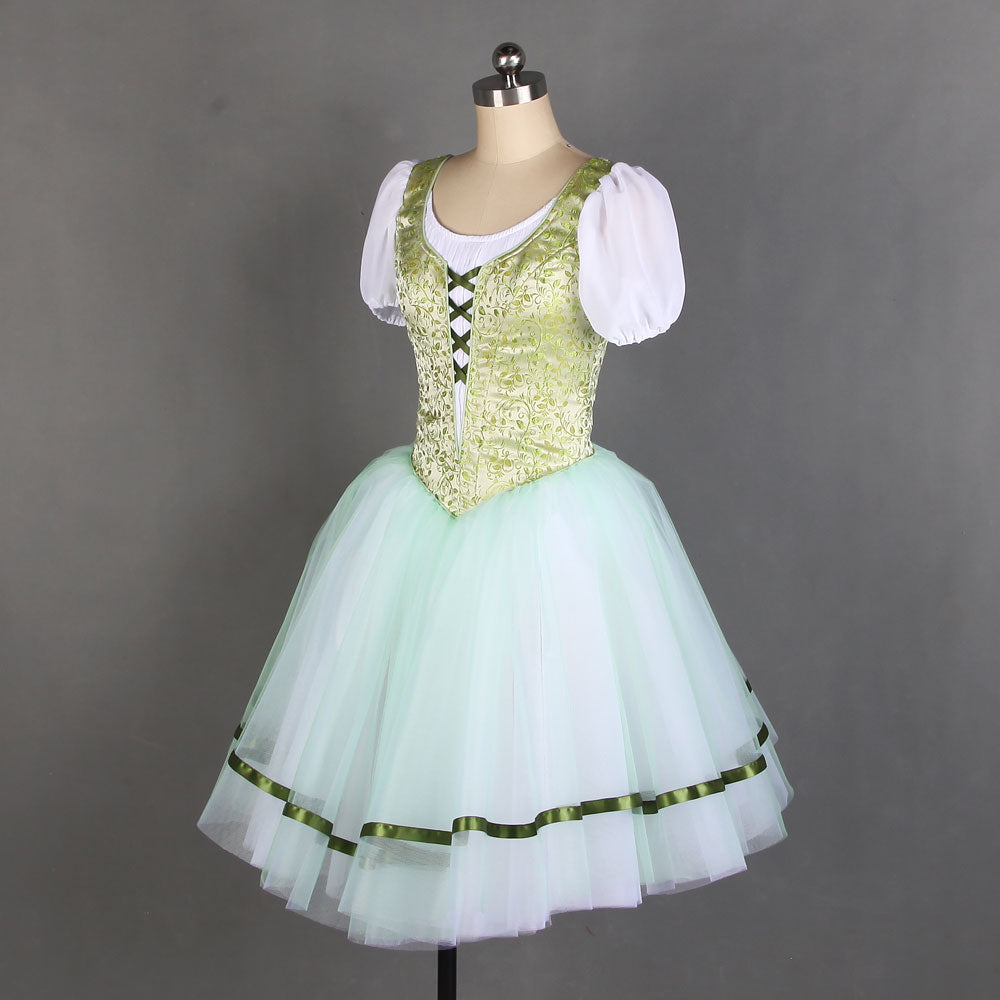 The professional tight bodice has been created with an incredible shade of pale olive green brocade. The bodice features the typical laced corset, and white short sleeves. The Romantic skirt is white, white the first layer is very pale olive green. There are ribbons decorating the edges of the skirt. This costume is very light and created with the highest quality fabrics or a wonderful stage effect.