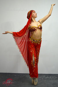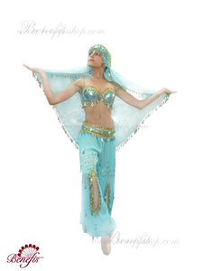 The costume is carried out in accordance with the Eastern traditions with characteristic décor elements and headpiece.