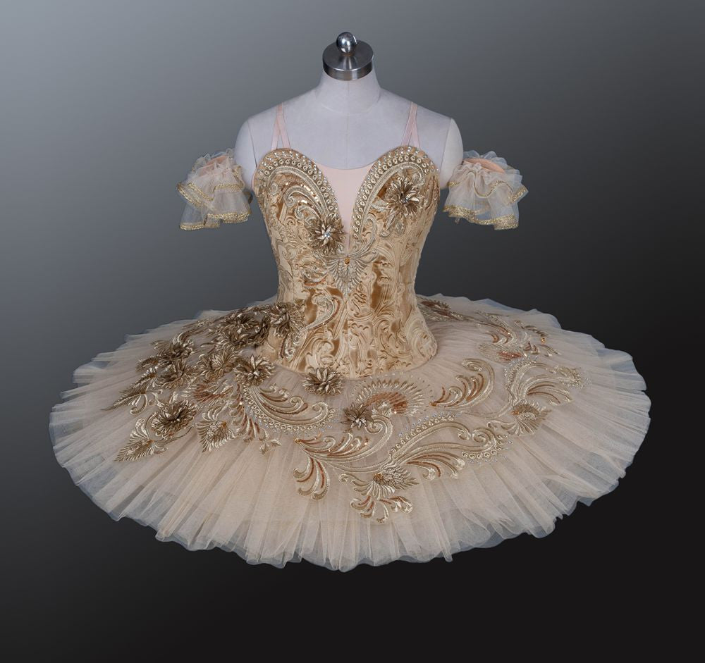 The professional, 12 layers tutu skirt is white, embellished with a white overlay entirely embroidered with gold appliques, crystals and sparkles.