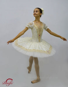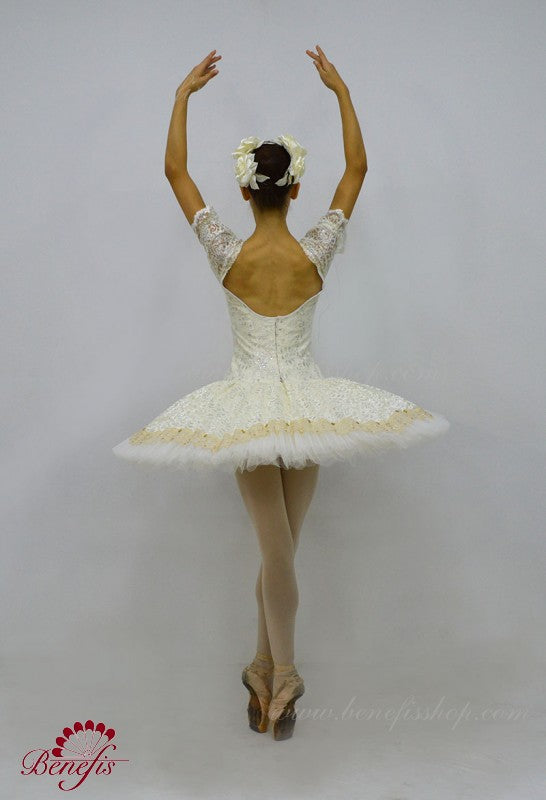 The hooped, ten layers, white platter tutu skirt is hand pleated and hand tacked. There is a brocade tutu skirt matching with the bodice and embellished by ivory lace.