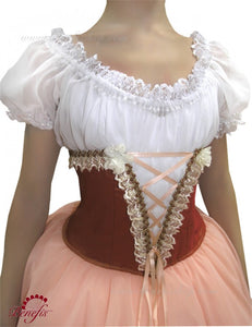 A complex bodice is made of the semi-stretched fabric with a decorative lacing in front; it passes into chiffon light blouse with sleeves in the shape of small lamps on the elastic band.