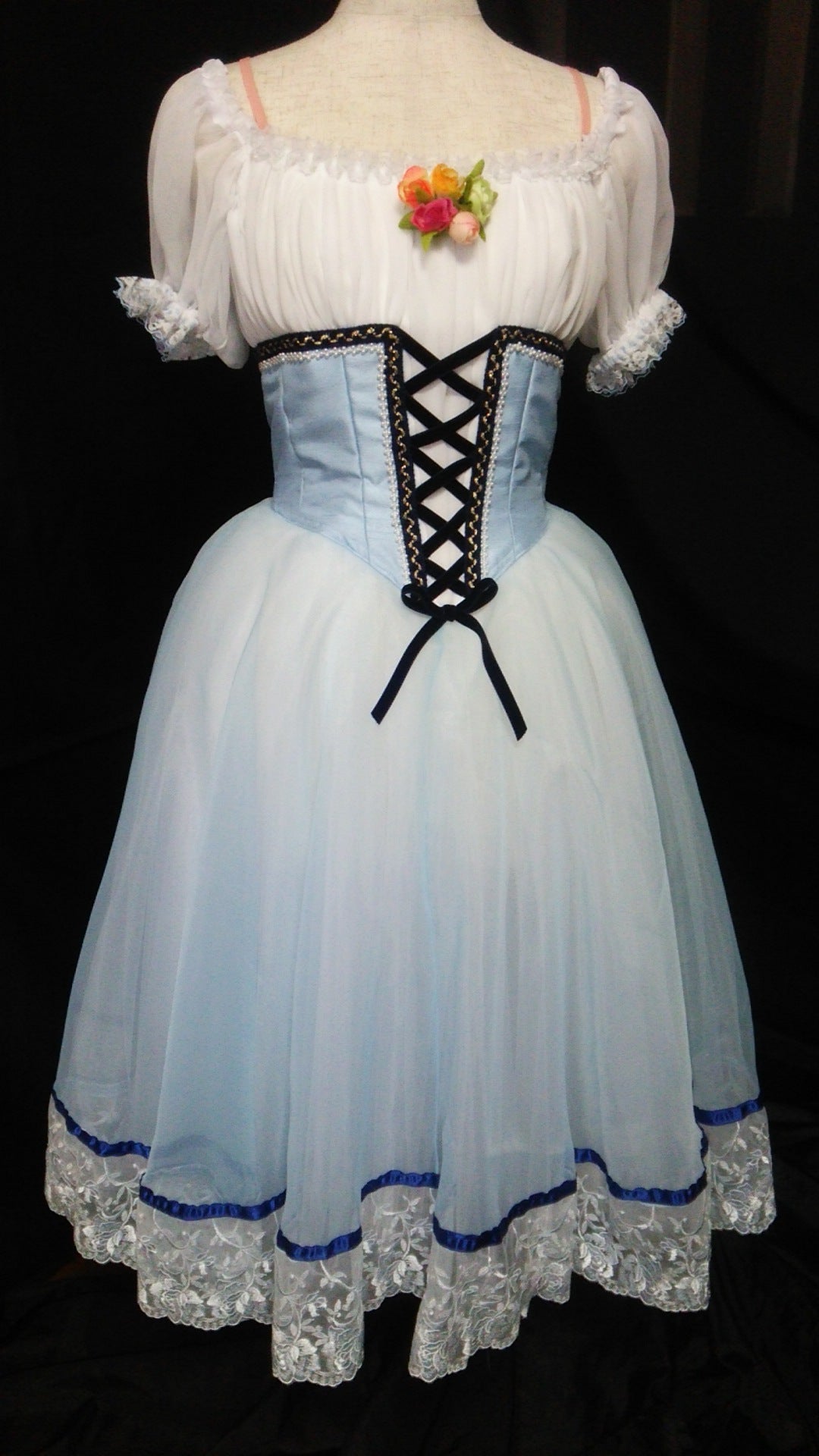 Thelower part of the bodice has been made with pale blue silk taffetas, and features the typical peasant front lacing and the white undershirt, with puffy white short sleeves. The lacing has been made with black ribbons, that create a beautiful contrast. Thin white lace decorates all around the round neck and on the edges of the sleeves. Silk flowers were sewn in the middle of the round neck.