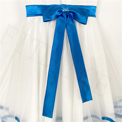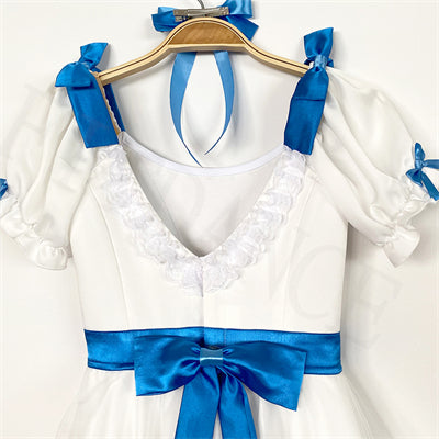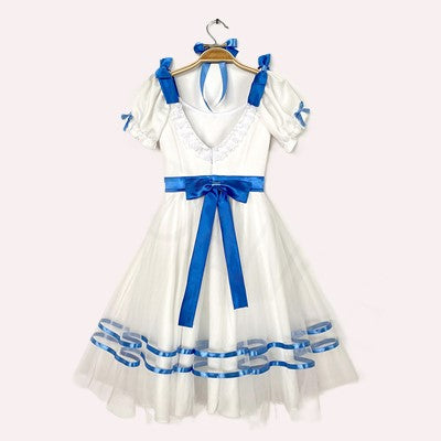 This stage costume features a round neck and a V-shaped back, white semi-stretchy bodice with hooks and eyes closing, and short balloon sleeves. The round neck is decorated with white lace, blue satin bows on the top of the shoulders, blue satin decoration across the bodice and a blue satin belt with bow in the back.