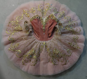 The professional, ten layers, hooped tutu skirt matches the bodice and is covered by god appliques and sparkles.