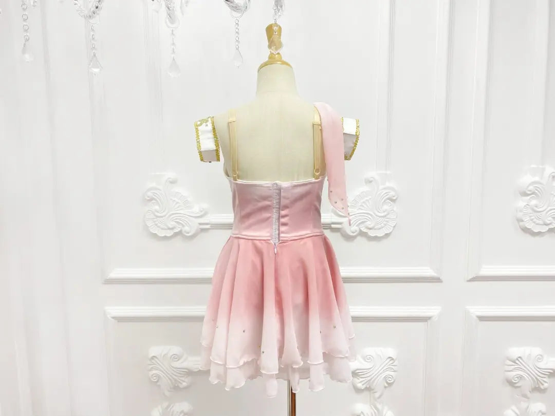 The pale pink chiffon, two layers skirt also features gradient shades of pink, and is embellished with sequins.