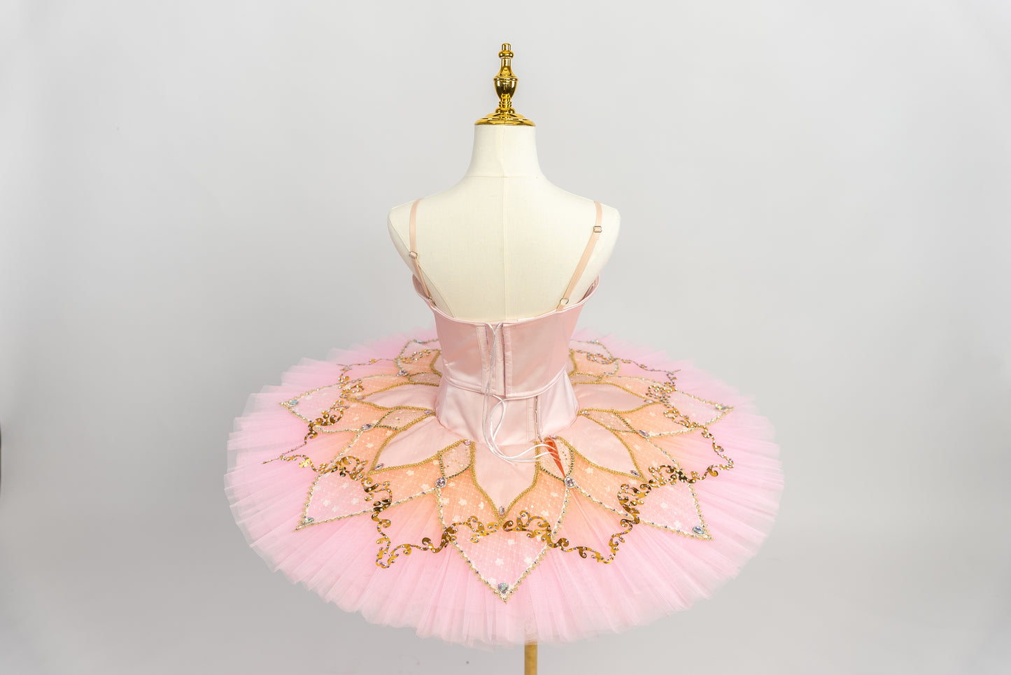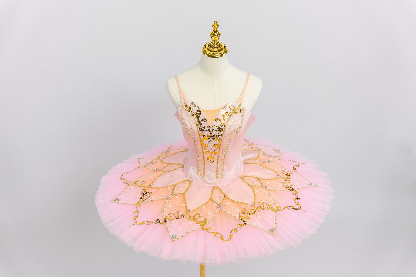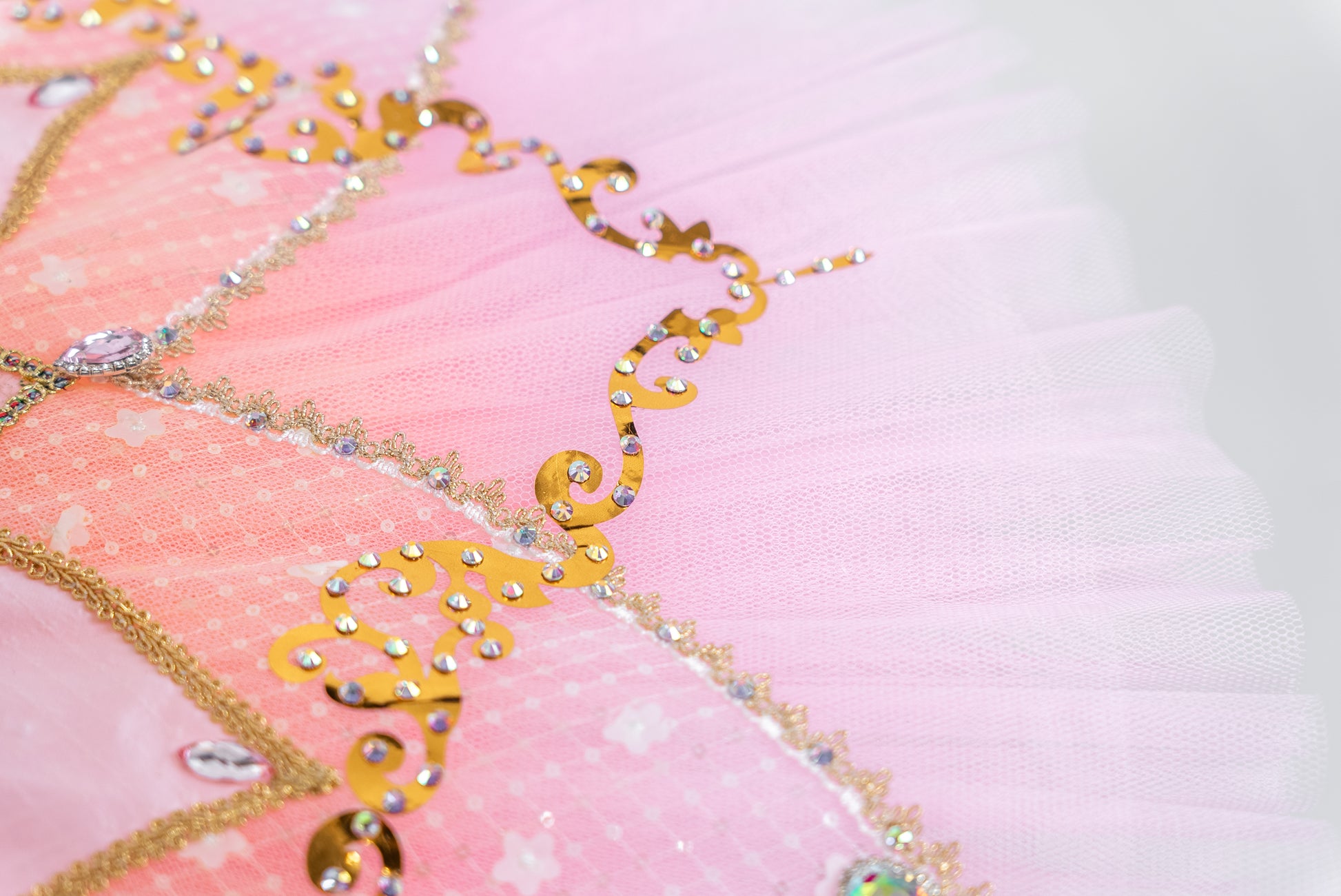The platter, pink tulle professional skirt features a flower-shaped tutu skirt overlay made of the same fabric as the bodice, as well as extremely rich decoration with golden appliques, trims and sparkles.