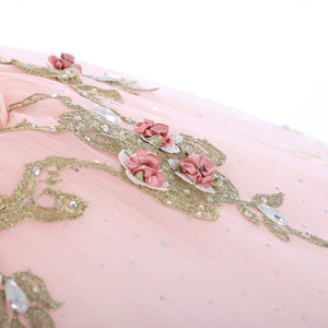 The bodice is entirely made with fully lined pink lace. Deep V cut with nude insert. Small rose buds as appliques all along the bodice, as well as dark gold appliques and crystals.