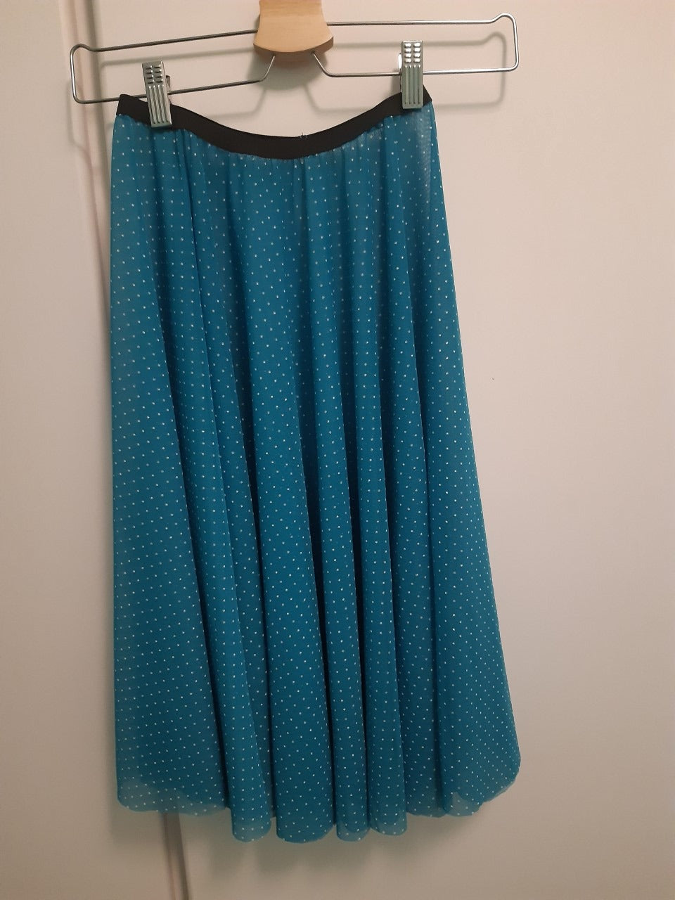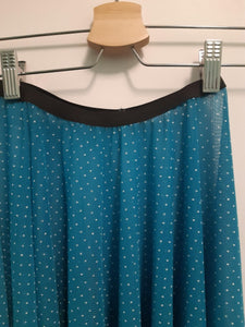 A charming deep blue mesh circular skirt with ivory polka dots pattern.
