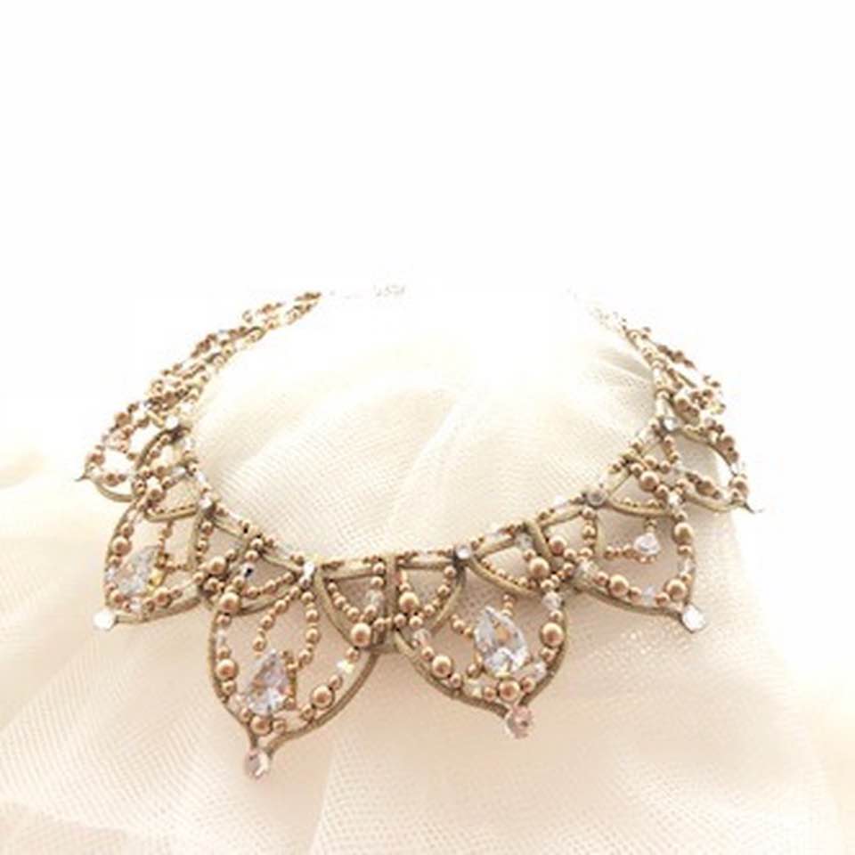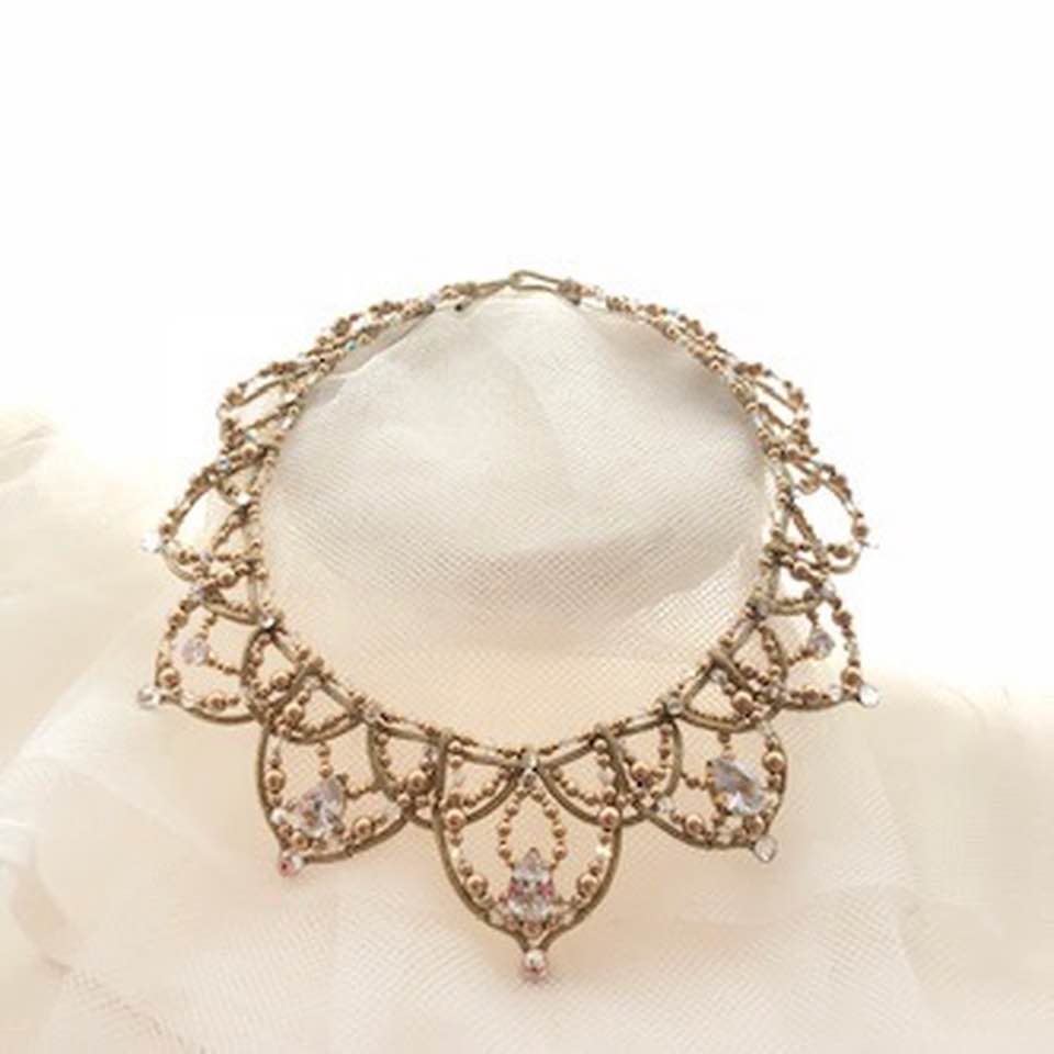 Entirely hand made by a famous Japanese artist, on a golden base, this necklace features clear Swarovski crystals and golden beads. A real dream come true for any dancer!