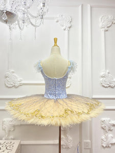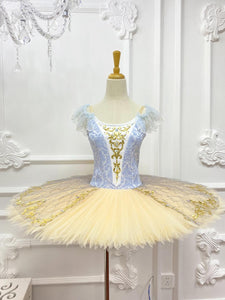 The ten layers tutu skirt is pale golden yellow and created a wonderful contrast with the bodice. There is a glittery tule overlay, opened in the center, entirely decorated with gold appliques, crystals and sparkles. A real princess tutu, suitable for high level performances!