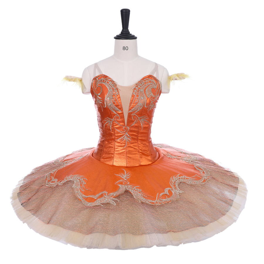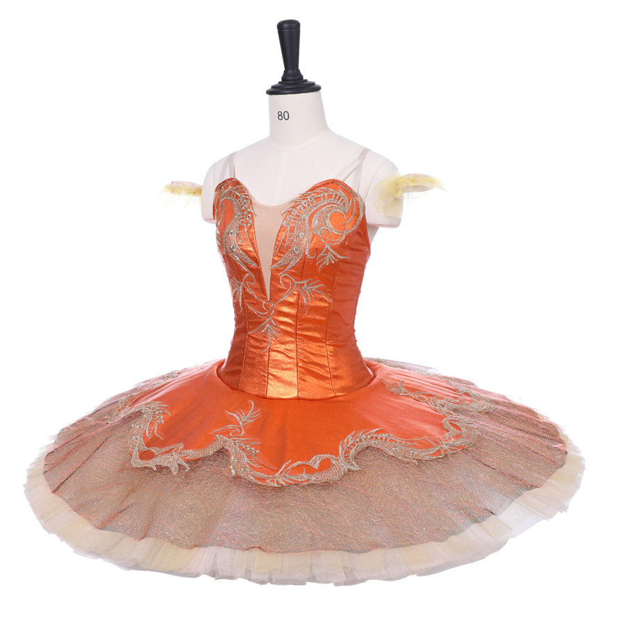 This professional platter tutu features a delightful, ombre' peach color. The bodice is made using hand dyed, shiny peach satin with gradient tones, and is richly decorated with pink flower appliques.