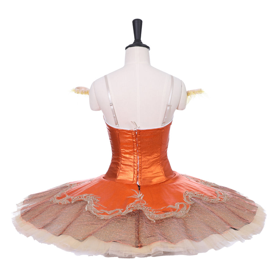 The professional, twelve layers tutu skirt is hand dyed with gradient tones of peach, fading to white, and features a peach overlay, pink appliques and golden trims.