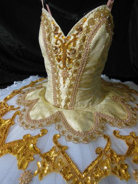 This white and gold tutu has been created for the role of Raymonda. It is also suitable for roles like the Gold Fairy in Sleeping Beauty or for other classical variations. The golden bodice is heavily decorated with gold trims, beads, sparkles and gold sequins. It features nude straps and arm ruffles included.
