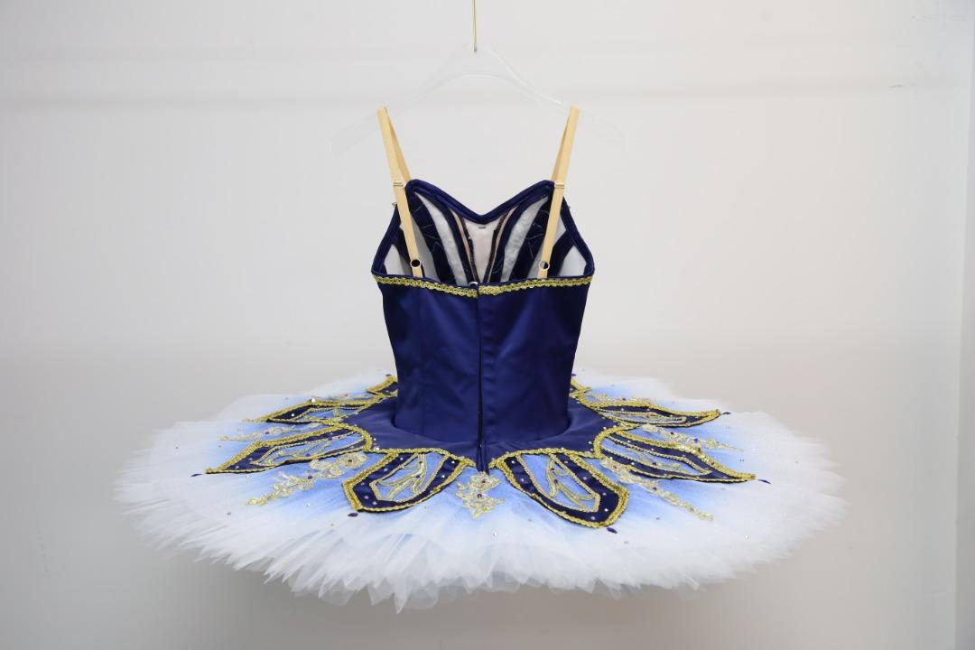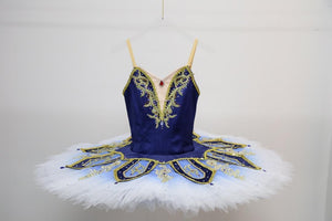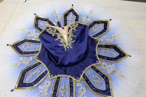 The ombre' dyed, 10 layers pancake tutu skirt, features fading shades of sky blue. There is a deep blue, satin tutu skirt decorated in gold, and rich decorations matching the bodice.