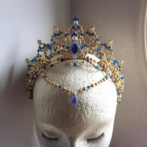 One of our most impressive headpieces! This blue and clear Swarovski professional tiara features pale blue crystals in different shapes and sizes, a silver frame, white pearls, a big central blue stone and a dramatic front drop.