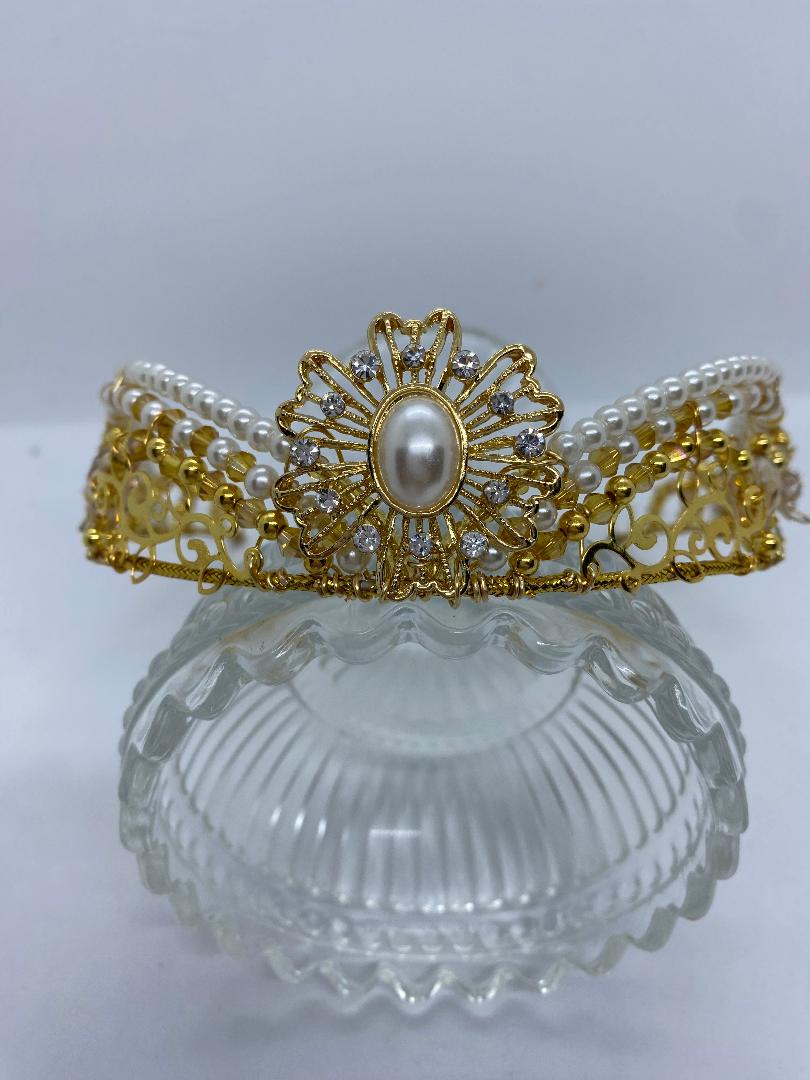 Built on a golden wire base, this tiara features gold beads and white pearls, and sizes. An oval big pearl as central piece complete the stunning look of this must-to-have accessory.