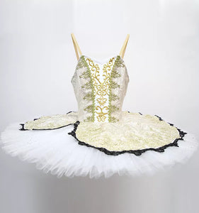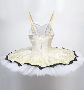 The professional, pancake skirt is carried out with high quality white glitter tulle. There is a brocade overlay which opens on one side, embellished with back lace.  This is a real regal costume, suitable for any "princess role".