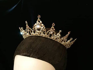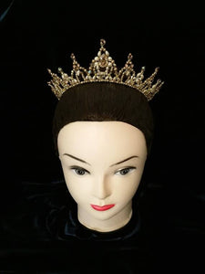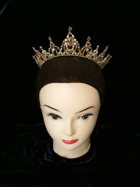 This entirely hand crafted queen or tsarina tiara has been designed by a famous Italian artist, for Dancewear by Patricia. It is entirely built on a golden frame, with golden beads and pearls, and clear Swarovski crystals.
