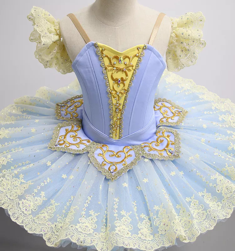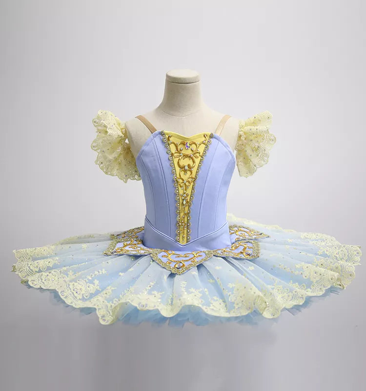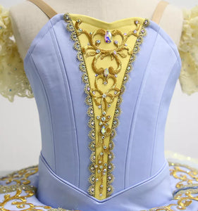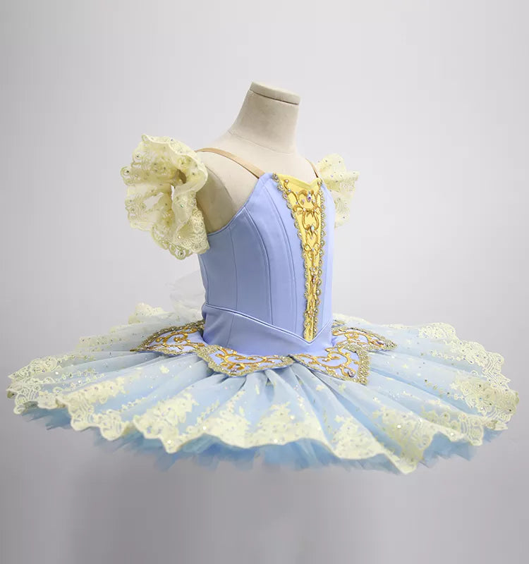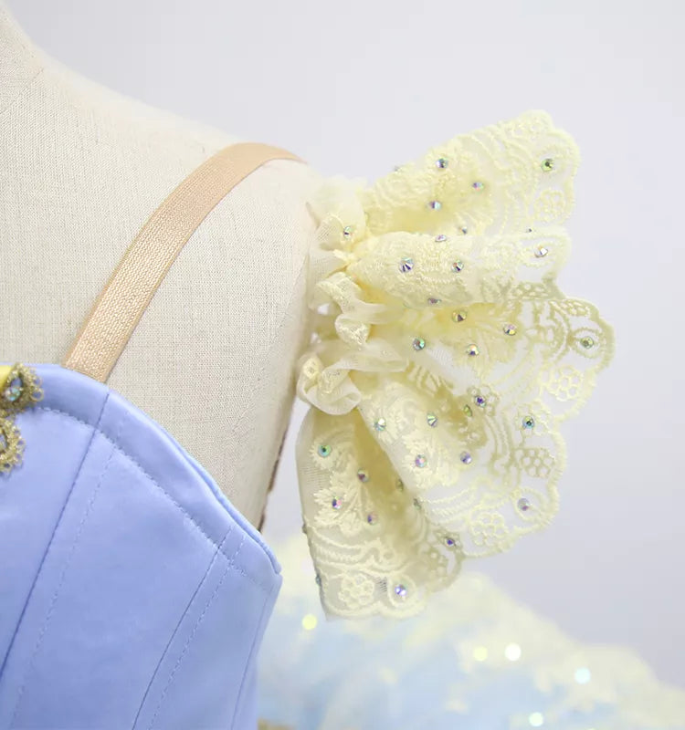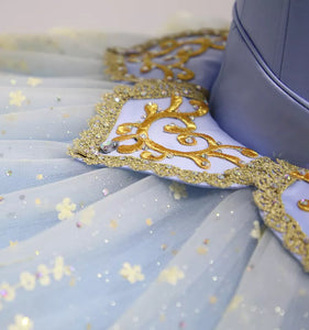 The arm bands are made of beige lace. The professional, ten layers pancake tutu skirt is pale blue, to match the bodice. It has a white lace overlay, and a flower shaped, pale blue tutu skirt, richly embellished with golden appliques.
