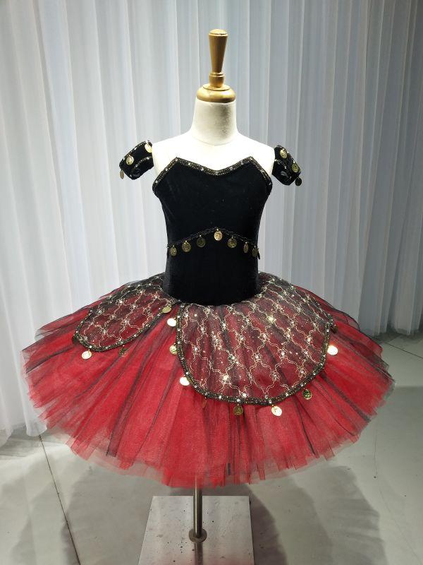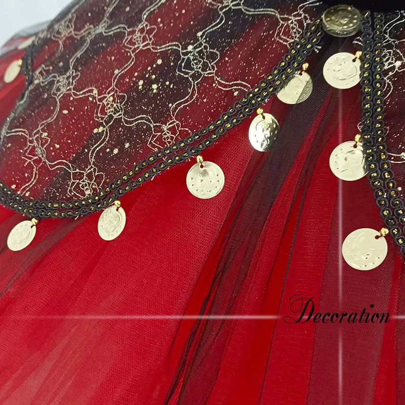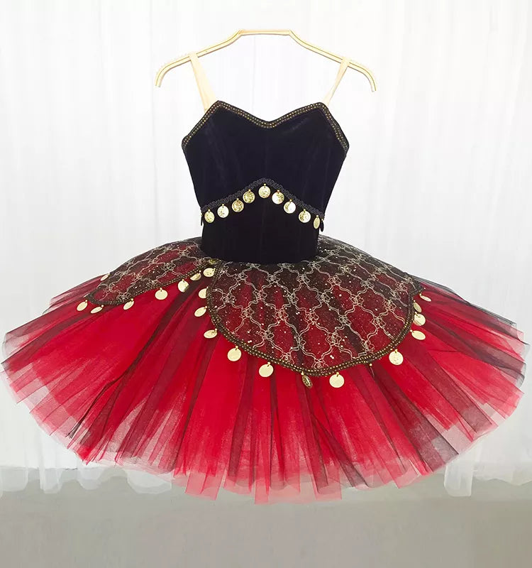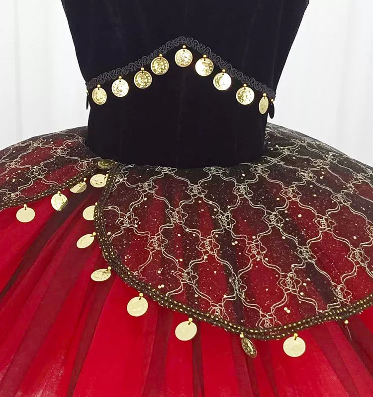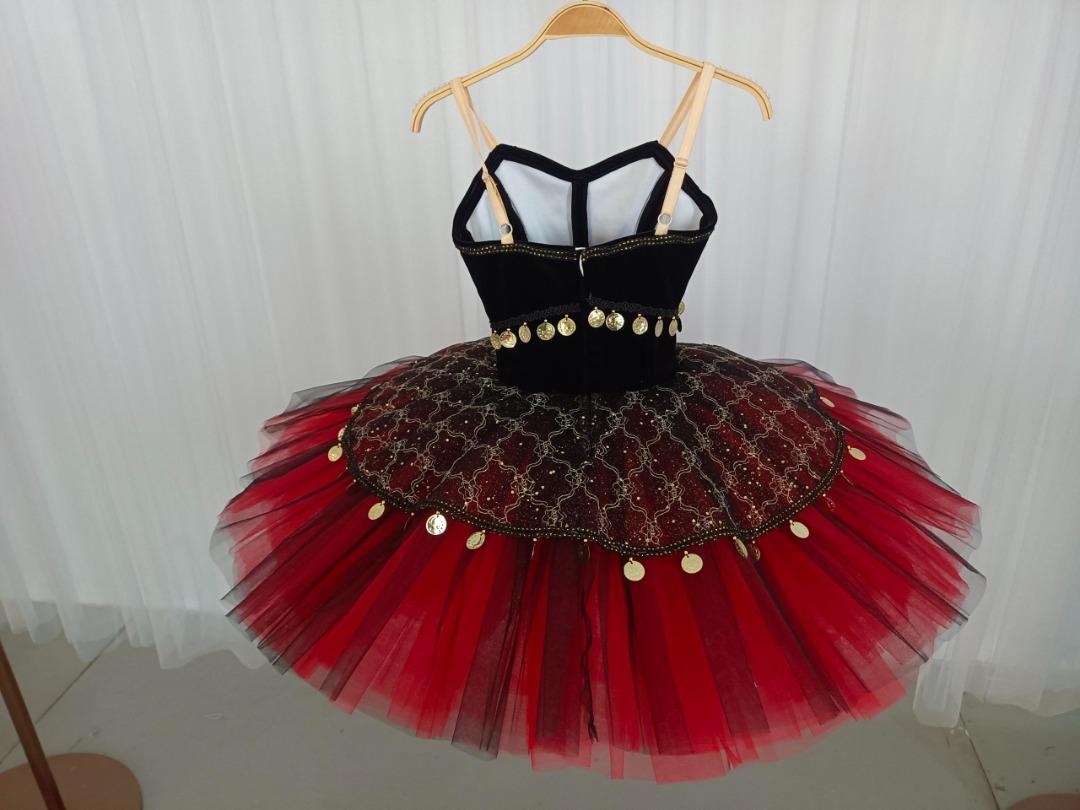 The bodice is made with black, high quality velvet and features decorations with golden and black trims, and golden coins. The bell-shaped tutu skirt is red, decorated with a shiny black and gold overlay and multiple golden coins.