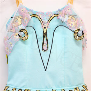 The bodice of this stage costume is made with semi stretchy aqua satin and closes in the back with hooks and eyes. The design both on the bodice and on the skirt is inspired by the Egyptian style, typical of this ballet. Decorations are made with back and golden trims, and pink lace cap sleeves are attached to the nude straps.