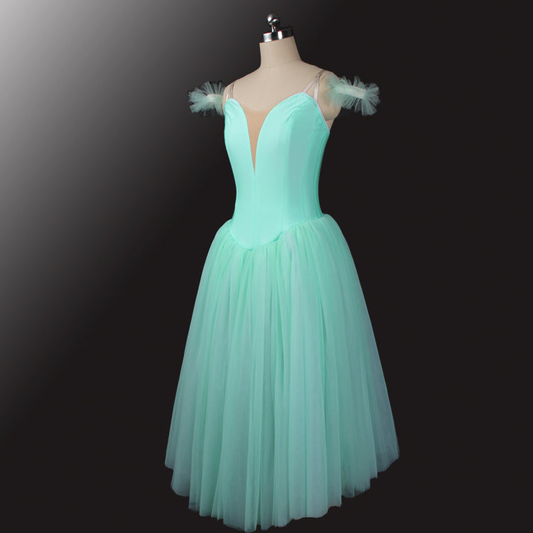 A professional, mint/aqua green Romantic tutu suitable for any classical solo or ensemble ballet.