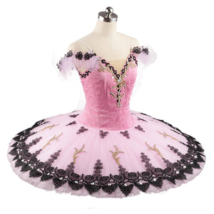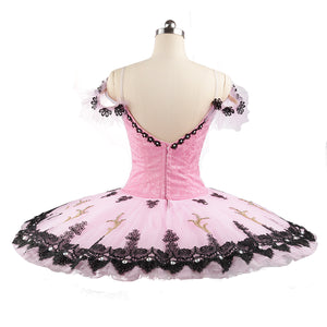 The tutu skirt is pink, and the first of the 10 graded layers is decorated wih black lace, black and gold appliques, and pearls.